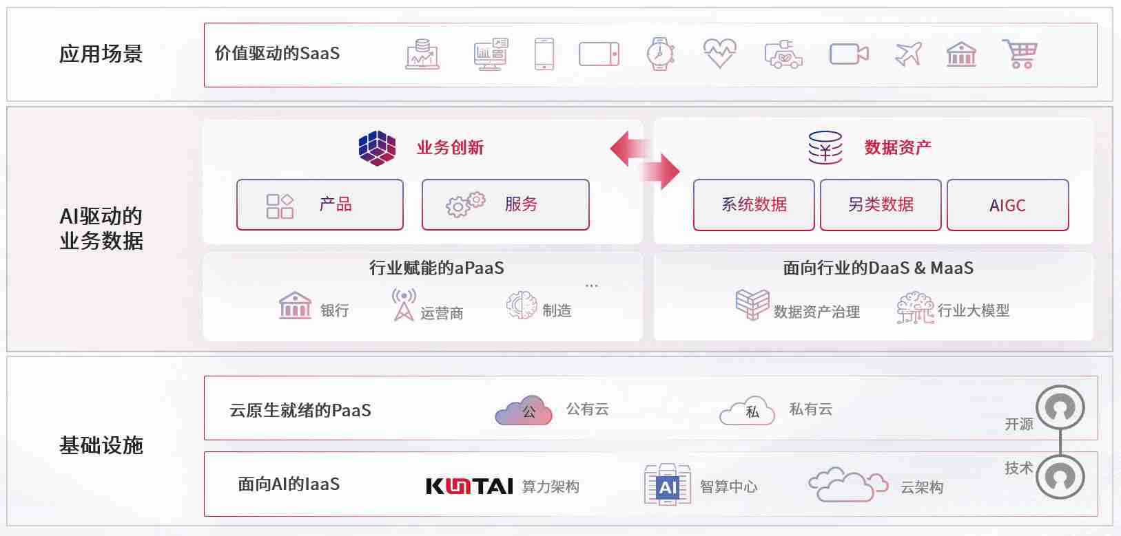 数字时代,,,,围绕企业数字化转型的关键要素,,,,南宫28WD数码开创性的提出数云融合战略和技术体系框架,,,着力在云原生、、、数字原生、、、、AI原生和信创产业上架构产品和服务能力,,,为处在不同数字化转型阶段的快消零售、、、、汽车、、金融、、医疗、、政企、、、教育、、、、运营商等行业客户提供泛在的敏捷IT能力和融合的数据驱动能力,,构建跨界融合创新的数字业务场景和新业务模式,,助力企业级客户建立面向未来的核心能力和竞争优势,,全面推动社会的数字化、、、、智能化转型升级。。。